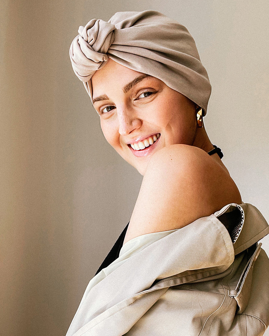 Turban Mütze ROSIE aus sandfarbenem Baumwoll-Jersey. Elastische Passform. Knoten-Detail auf der Vorderseite, Raffung am Hinterkopf.
