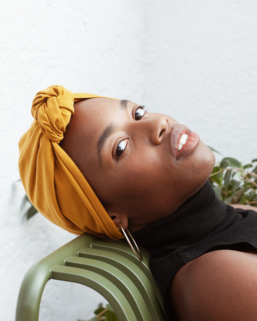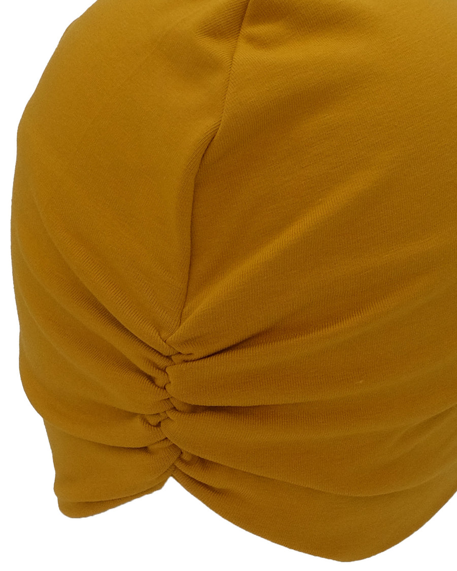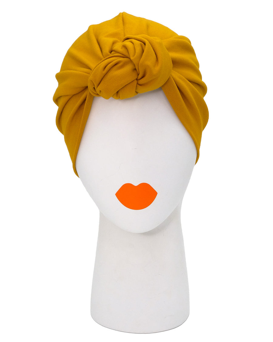 KNOT turban in mustard yellow cotton jersey. Elastic fit. Knot detail at front, gathers at back.